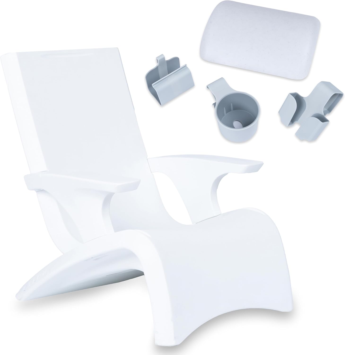The Step2 Vero Adirondack Chair and Pool Lounge Accessory Bundle offers a stylish and comfortable poolside seating solution. The fade- and water-resistant Adirondack chair can support up to 300 pounds and be filled with sand to weigh it down in water up to 9 inches deep. Its sleek, ergonomic design adds modern elegance to patio, pool deck, or fireside seating. The 3-piece pool lounge accessory set complements any Vero collection lounger or chair, securing to built-in grooves. The adjustable soft resin pillow enables personalized comfort. The cup holder fits drinks up to 32 oz, while the phone holder protects devices from water. Both durable accessories match Vero collection aesthetic. Together, the weighted pool chair and coordinating accessories provide an adaptable poolside relaxation hub. The bundle combines weather-resistant and easy-to-clean construction with versatility, portability, and security for drinks and phones. Personalize your leisure with this complementary set blending style, stability and utility.